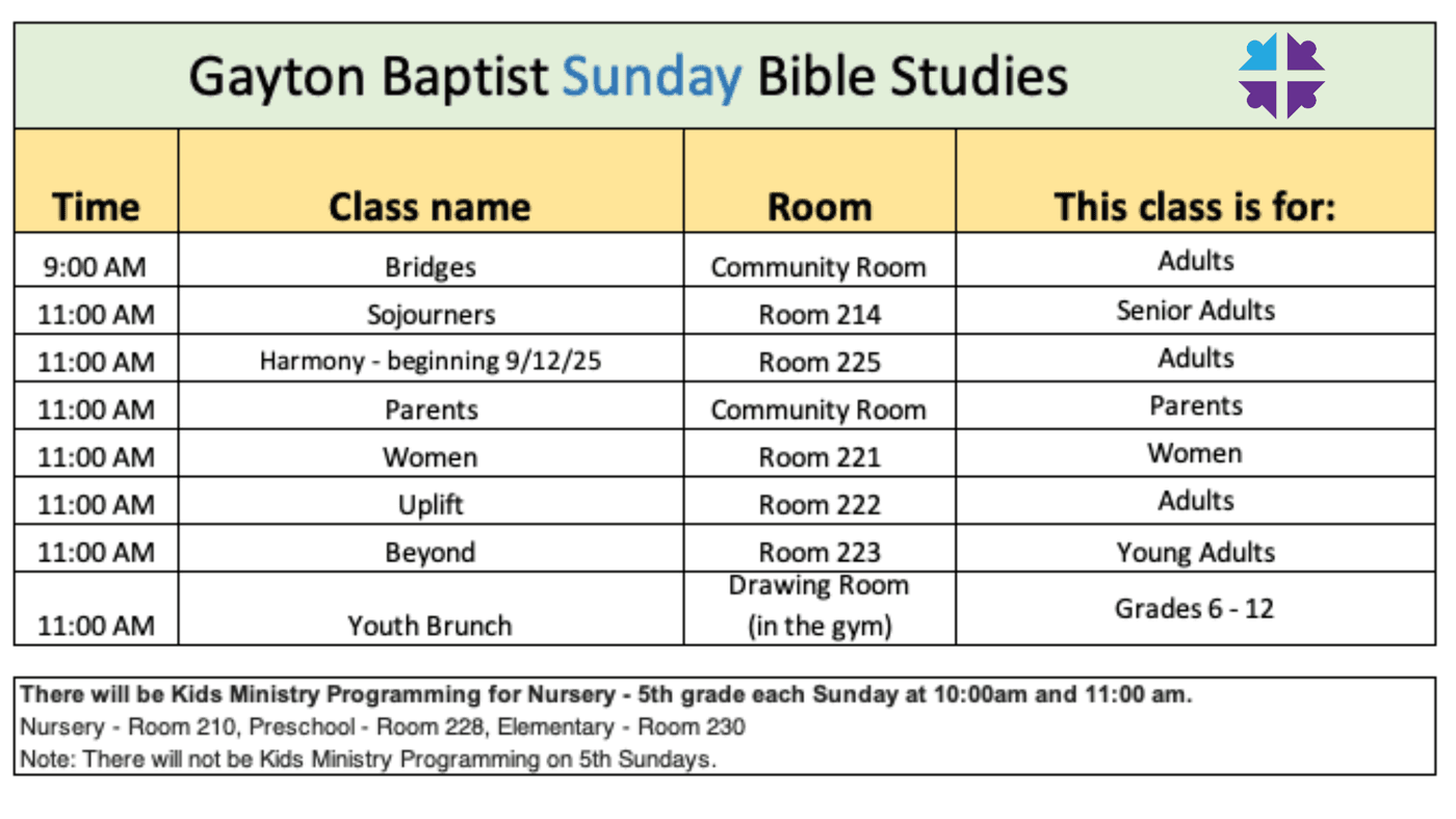 - Harmony (Senior adult couples): This is a lecture and discussion style Bible study class using Right Now media as a resource, studying books of the Bible and enjoying relevant topical studies as well.