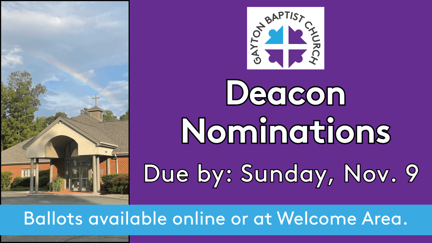 The next Gayton business meeting will be a hybrid meeting and held on Wednesday, Nov. 19 at 6 PM. Members may attend and vote in person in the Worship Center or via Zoom. A Zoom link will be sent out previous to the 19th and all votes will be counted during the meeting. We will have ministry and finance reports, as well as elections for deacons and other council members.
