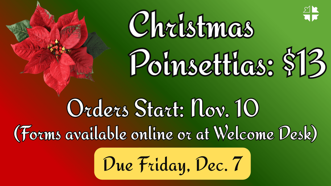 Poinsettias will decorate our Worship Center throughout the Christmas season and may be picked up on Christmas Eve.