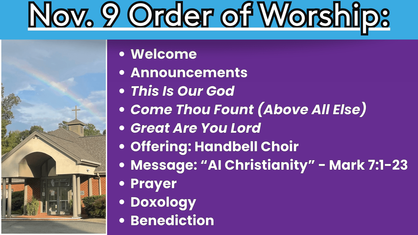 This Sunday, Rev. Bryon will share a message titled “AI Christianity” from Mark 7:1–23 — a reminder that faith isn’t artificial or performative, but alive and authentic from the inside out.