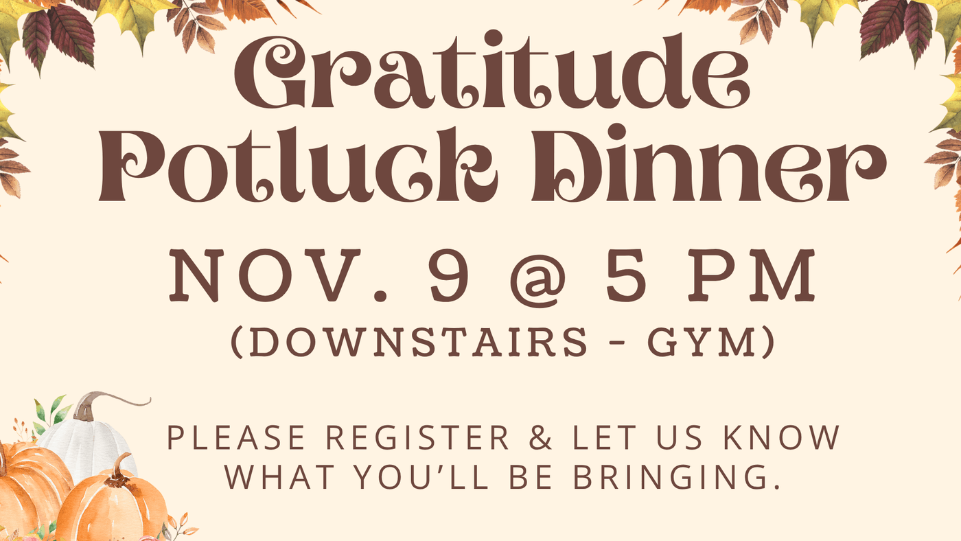 Join us as we celebrate God’s goodness and the gift of community at our Potluck Gratitude Dinner this Sunday, Nov. 9 in the Gym.
